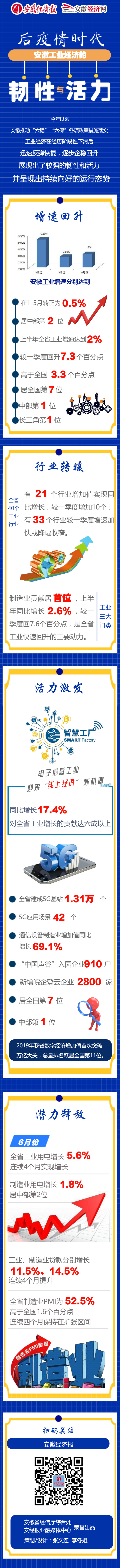 今年以来,面对突如其来的新冠肺炎疫情和错综复杂的经济发展形势,全省上下认真落实党中央、国务院和省委、省政府决策部署,全力推动“六稳”“六保”各项政策措施落实,全省工业经济在经历阶段性下滑后,迅速反弹恢复,逐步企稳回升,展现出了较强的韧性和活力,并呈现出持续向好的运行态势。一是工业增速迅速回升,运行态势持续向好。由于新冠疫情对工业生产造成短期严重冲击,前2个月全省规模以上工业增加值同比下降12.1%。但随着企业陆续复工复产,工业经济运行秩序加快恢复,尤其是进入二季度以来,运行态势逐渐趋好。4、5、6月份全省工业增速分别达到9.1%、7.8%、8%,均居中部首位。全省工业累计增速在1-5月转正为0.5%,居中部第2位;上半年达到2%,较一季度回升7.3个百分点,高于全国3.3个百分点,居全国第7、中部第1、长三角第1位。二是行业发展逐步转暖,生产信心明显提振。随着“六稳”“六保”各项政策措施落实落地,行业生产趋暖态势明显。上半年,全省40个工业行业中,有21个行业增加值实现同比增长,较一季度增加10个;有33个行业较一季度增速加快或降幅收窄。工业三大门类中制造业贡献居首位,上半年同比增长2.6%,高于全省规模以上工业0.6个百分点,较一季度回7.6个百分点,是全省工业快速回升的主要动力。三是数字经济发展迅猛,创新活力有效激发。上半年,受疫情因素影响,电子信息工业迎来“线上经济”新机遇,同比增长17.4%,对全省工业增长的贡献达六成以上。全省建成5G基站1.31万个,5G应用场景42个,通信设备制造业增加值同比增长69.1%。软件产业集群化发展提速,“中国声谷”入园企业910户。“皖企登云”计划有序推进,全省新增“皖企登云”企业2800家。近日《中国数字经济发展白皮书(2020年)》披露,2019年我省数字经济增加值首次突破万亿大关,总量排名跃居全国第11位。四是支撑指标持续向好,发展潜力加速释放。上半年,全省工业用电降幅收窄至0.7%,高于全国1.7个百分点,其中6月份增长5.6%,连续4个月实现增长;制造业用电增长1.8%,高于全国4.8个百分点,居中部第2位,其中6月份增长9.5%,连续3个月回升。工业、制造业贷款分别增长11.5%、14.5%,连续4个月提升。6月份,全省制造业PMI为52.5%,高于全国1.6个百分点,连续四个月保持在扩张区间。实物量及预期性指标均显示工业经济运行持续向好态势有较强的支撑。总体上看,上半年全省工业经济快速回升、行业发展逐步趋暖、数字经济发展迅猛、匹配指标持续向好。但同时也面临着中小企业困难较多、内外需求压力依然较大、部分行业承压较重、企业投资信心不足等较多不确定性因素,应引起高度关注。下一步,我们将坚持以习近平新时代中国特色社会主义思想为指导,认真落实党中央、国务院和省委、省政府各项决策部署,狠抓“六稳”“六保”重大政策落实落地,加快推进重大项目建设,抓好专项贷款和转贷款落实,用好“专精特新”发展基金直投,撬动更多社会资本投入重大项目建设;深入推进智能制造和企业数字化转型工程,培育一批省级智能工厂、数字化车间、工业机器人应用点;推动“5G+工业互联网”创新发展,加快5G基站和场景应用项目建设;持续优化营商环境,开展优秀民营企业和优秀民营企业家“双百”表彰,提振发展信心;全力稳住全省工业经济“基本盘”,努力完成年度各项目标任务。
