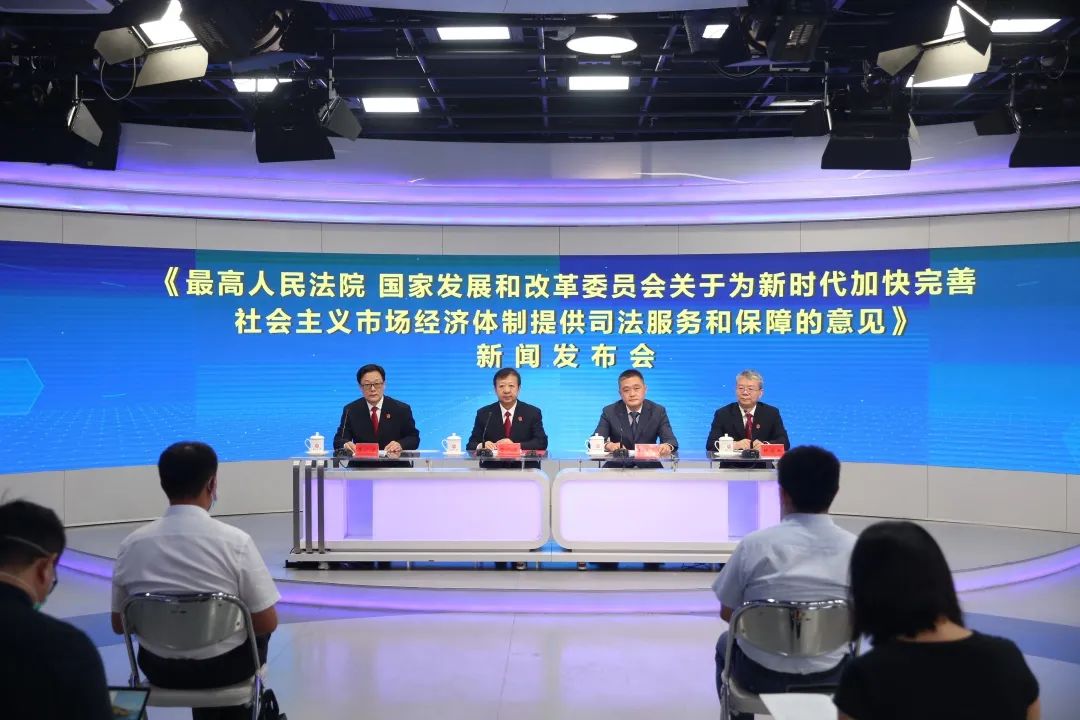 7月22日上午,最高人民法院联合国家发展和改革委员会共同举行新闻发布会,发布《最高人民法院 国家发展和改革委员会关于为新时代加快完善社会主义市场经济体制提供司法服务和保障的意见》。最高人民法院审判委员会副部级专职委员贺小荣,国家发展和改革委员会体改司副司长王任飞,最高人民法院审判委员会委员、民一庭庭长郑学林出席发布会并介绍相关内容。最高人民法院新闻发言人李广宇主持发布会。