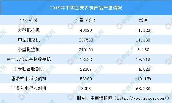 据中国农业机械工业协会统计,2019年统计内的拖拉机数据中,大型拖拉机产量为40020台,同比减少1.12%;中型拖拉机产量237535台,同比增长11.13%;小型拖拉机产量340100台,同比增长3.13%;自走式轮式谷物收获机产量18532台,同比增长19.71%;玉米联合收获机产量22367台,同比减少4.62%;履带式水稻收获机产量53969台,同比下降19.15%。此外,半喂入水稻收获机产量3258台,同比增长63.23%;压捆机产量同比增长10.68%;插秧机产量同比下降5.07%。