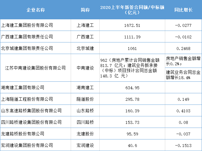 资料来源:各企业半年报、建筑时报、基建通